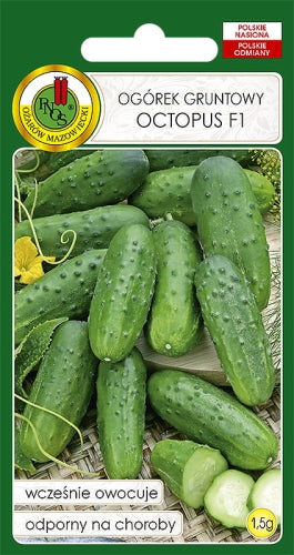 Odmiana grubo - brodawkowa średniowczesna, o bardzo silnym wzroście. Doskonała jakość, wysoki plon oraz zdrowotność roślin. Owoc cylindryczny, proporcja szerokości długości 3:1; rozjaśniony koniec oraz jasne smugi wzdłuż skórki owocu. Równomiernie rozłożone plonowanie. Wysoki udział plonu handlowego. Odmiana 'OCTOPUS' F1 to doskonały surowiec do kwaszenia i konserwowania. Jest odporna na parcha dyniowatych, tolerancyjna na mączniaka prawdziwego i rzekomego oraz wirusa mozaiki ogórka. Możne być stosowany w uprawach ekologicznych. Okres wegetacji 60-65 dni.